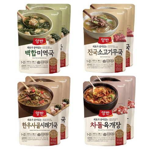 양반 백합 미역국, 차돌 육개장, 진국 소고기무국, 한우사골시래기국 460g 2p 세트는 당신의 식탁을 한층 더 특별하게 만들어 줄 것입니다. 간편하면서도 고급스러운 한식의 맛을 지금 바로 경험해보세요. 이 기회를 놓치지 마세요!